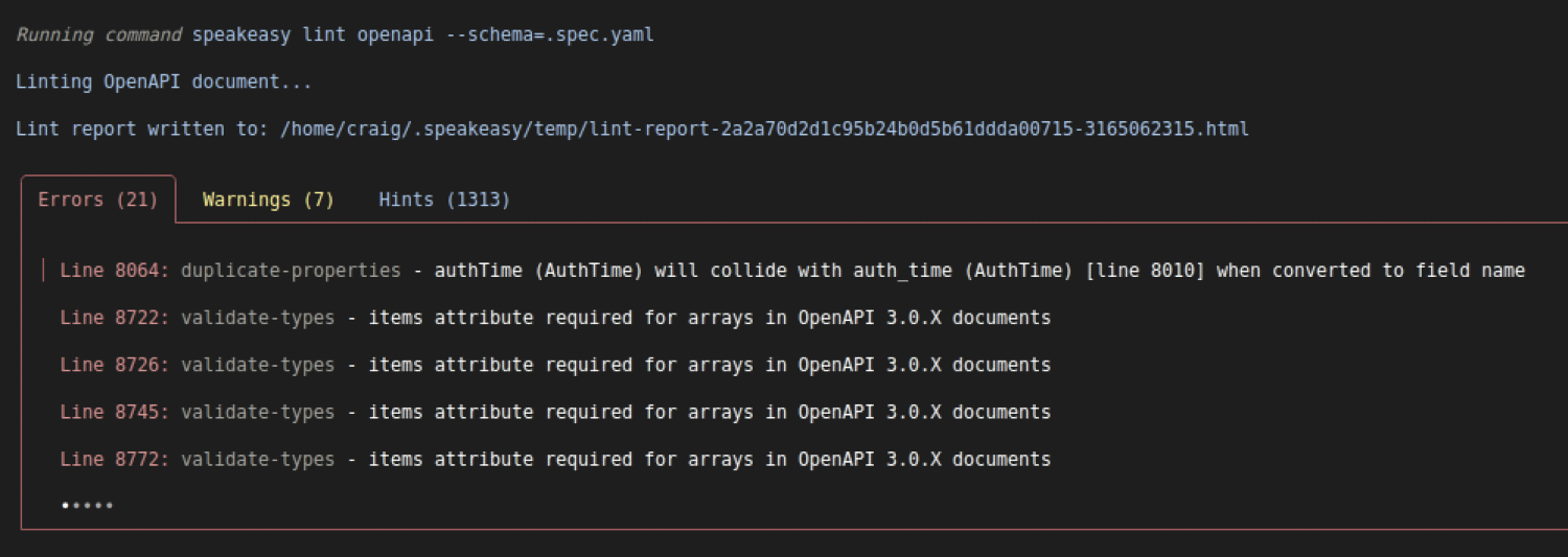 }Or, you could pull in a far more comprehensive OpenAPI linting tool, such as that from our friends at Speakeasy. It found this particular defect as the first hit (as well as 20 other defects that I have encountered, and that we haven't even discussed as part of this post):